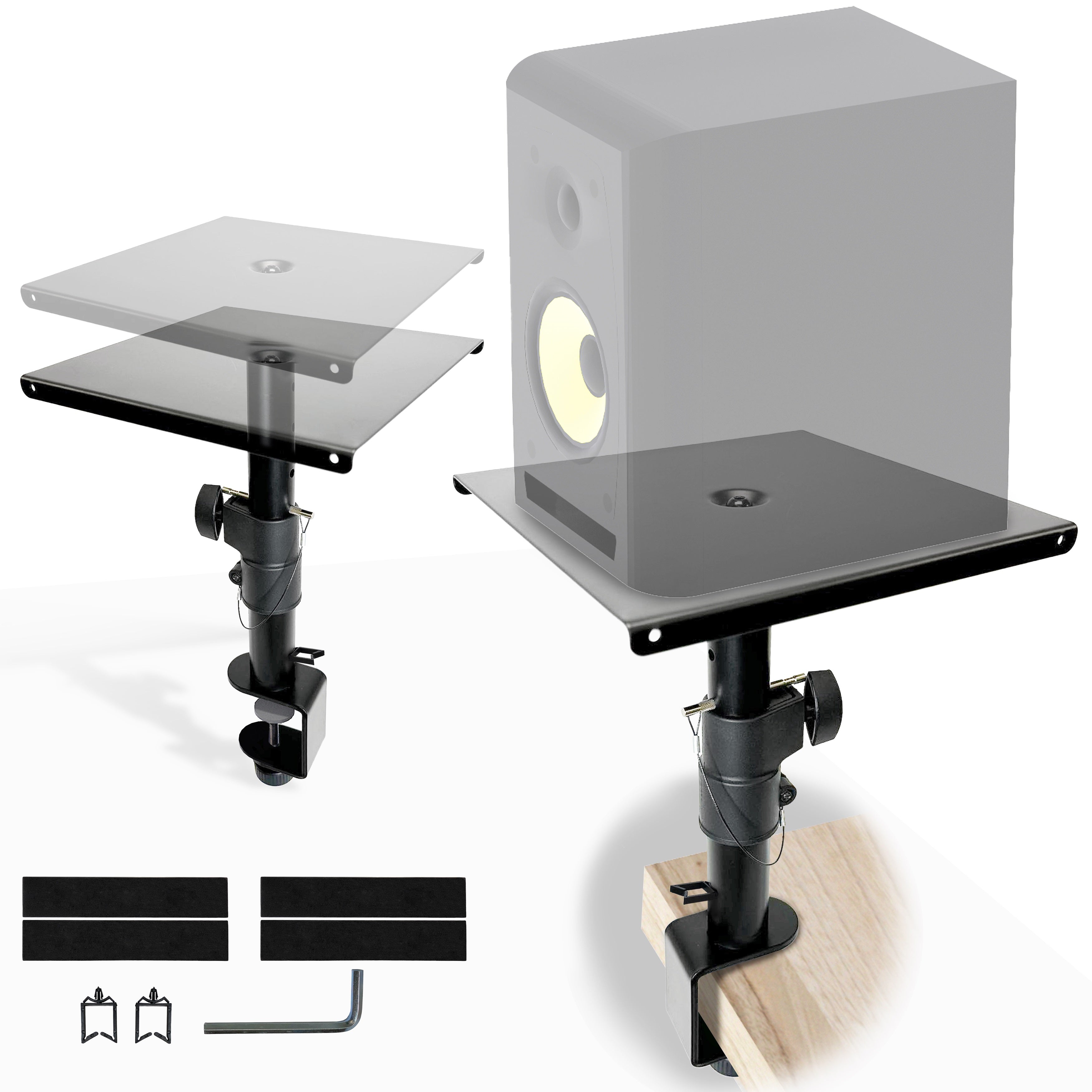 Introducing the AxcessAbles Desktop Speaker Stand Mounts, the ideal solution for maximizing your space without compromising on audio quality. Designed with versatility in mind, these compact speaker stands are perfect for various applications. Featuring a sleek and space-saving design, these small speaker stands are height adjustable, allowing you to customize the perfect listening experience. With the ability to accommodate speakers up to 10" in diameter, they provide a secure and stable platform for your valuable audio equipment. Crafted from heavy-duty steel, these stands offer exceptional durability and longevity. The rubber padding ensures that your speakers are protected from scratches and vibrations, enabling optimal sound reproduction. The sturdy base and adjustable height mechanism allow you to effortlessly position your speakers to achieve the best sound projection. Whether you're using studio monitors, speakers, or headphones, these stands provide the necessary support for an immersive audio experience. Assembly and adjustment are a breeze, thanks to the user-friendly design. The stands come complete with all the necessary hardware, ensuring a hassle-free setup process. Upgrade your audio setup with the AxcessAbles Desktop Speaker Stand Mounts and elevate your sound experience while maximizing your space.