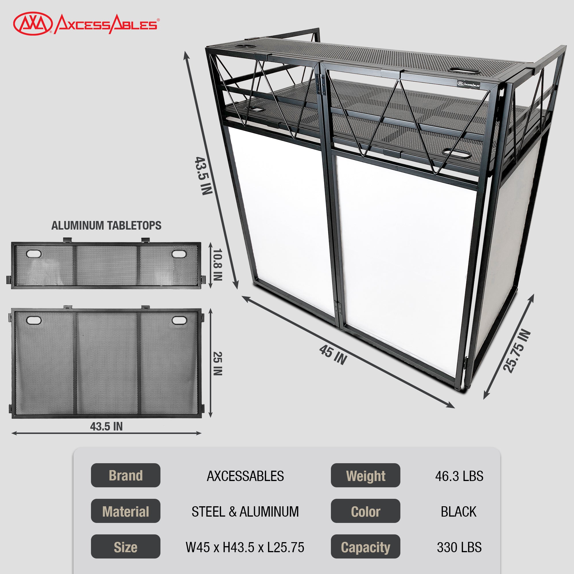 The aluminum wire mesh tabletop measures 43" wide x 25" deep—providing ample space for your DJ controller, mixer, laptop, and monitor speakers.