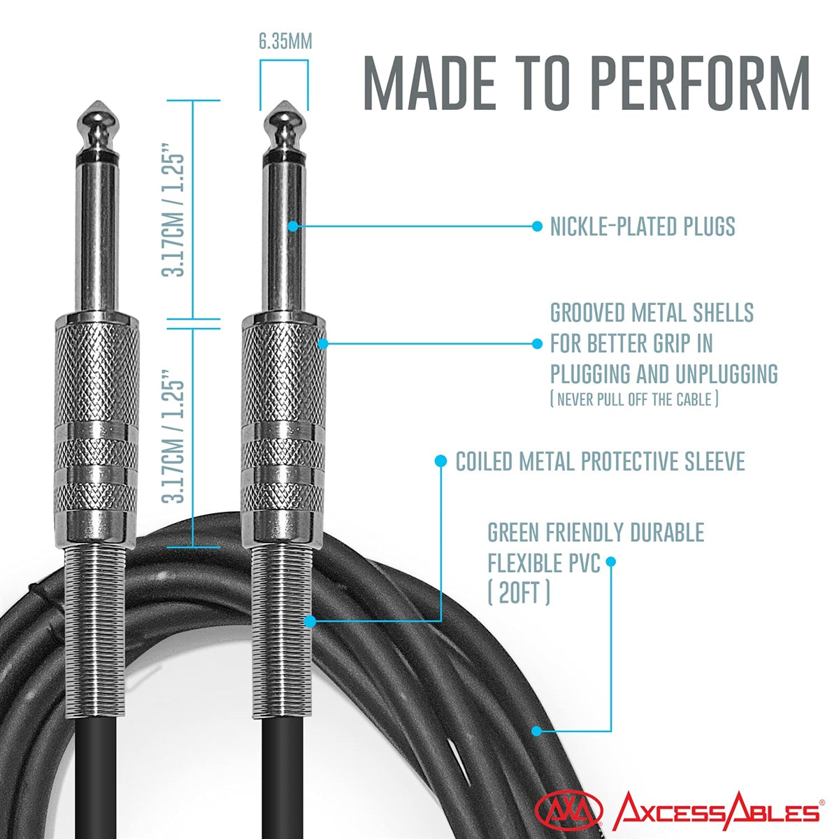 AxcessAbles 1/4-inch to 1/4-inch TS Guitar Audio Cable - 20ft | 6.35mm Instrument Cable